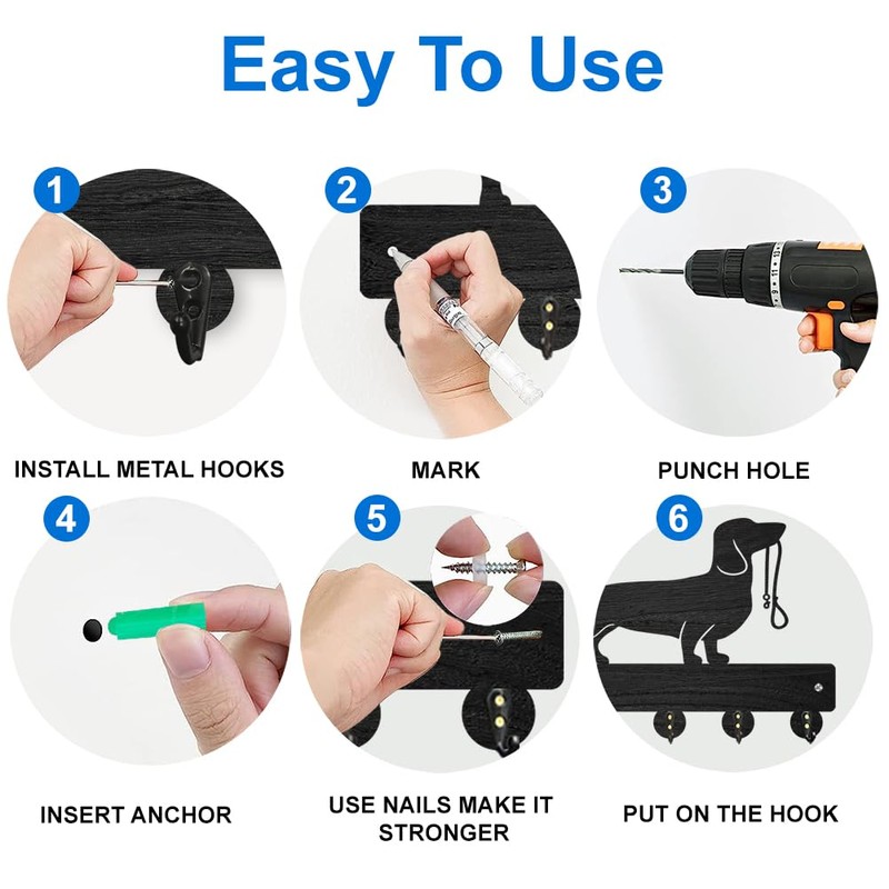 • Box contents: 1 key holder + 5 hooks (not installed) + 12 screws + 1 screwdriver + 2 dowels + 2 spacers. Size of the key holder: 11.8 × 7.9 inches/30 × 20 cm. The distance between two hooks is 2.4 inches/6.2 cm. With 2 holes, punched for attachment. The installation steps can be found please please see the picture..