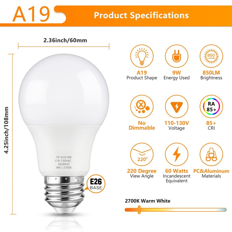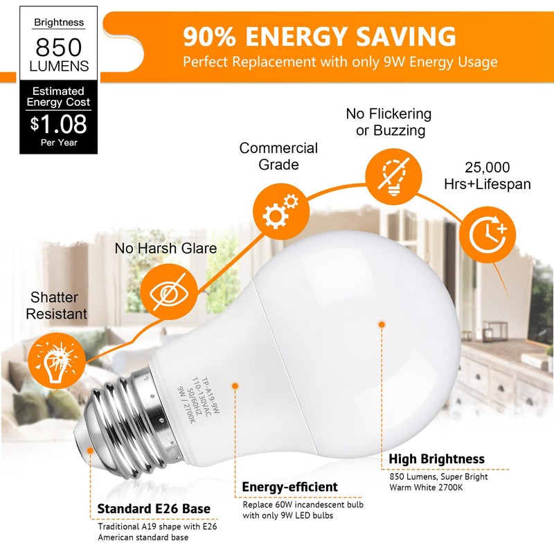 • Energy Efficient & Money Saving: Designed with energy-efficient LED chips, 9-watt A19 LED light bulbs offer you the perfect replacement for traditional 60w incandescent light bulbs. Based on 3 hours of use per day, the soft white LED light bulbs will reduce heat output meanwhile saving up to 90% on the electric bills of lighting. Note: These led light bulbs are NOT DIMMABLE.