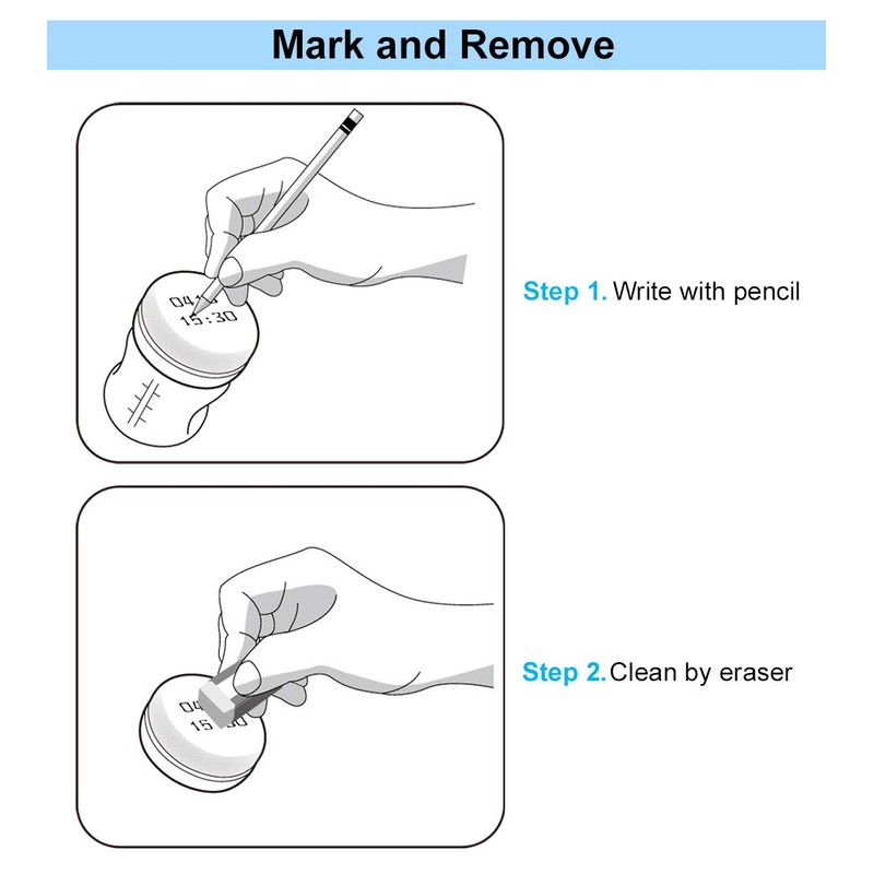 - Parte superior que se puede escribir en el lápiz: la parte superior plana sólida se puede marcar con un lápiz suave y quitar con un borrador. Puedes fechar la botella para saber la edad de la leche contenida, o nombrar la botella para que no se mezcle en el refrigerador de la guardería;