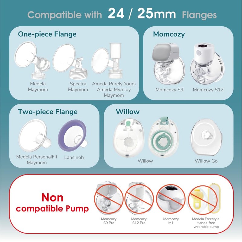 - Can be compatible with Spectra 24mm flanges, Ameda Purely Yours 25mm flanges, Ameda Mya Joy 25mm flanges, Willow 24mm flanges, Lansino 24mm flanges. Momcozy S9/S10/S12 Wearable Breastpump 24 mm cups ( NOT for 27 mm M1 cups)