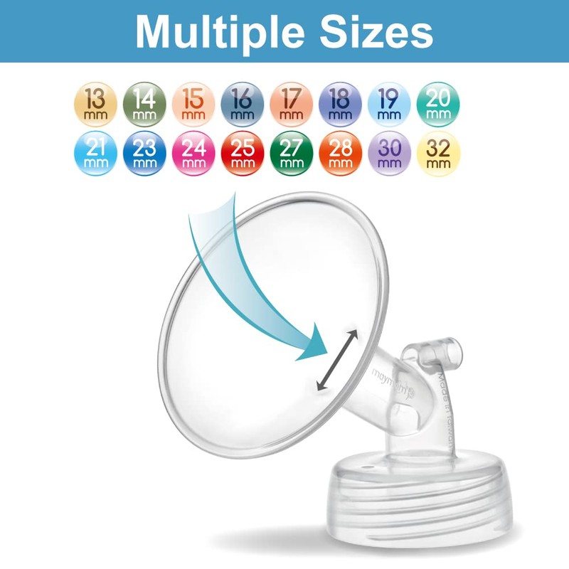 - MAYMOM FLANGE puede funcionar con botella Spectra de cuello ancho (botella de boca ancha), compatible con botella Avent y botella Maymom Widemouth. Tamaños de brida disponibles: 13 mm, 15 mm, 17 mm, 19 mm, 21 mm, 24 mm, 25 mm, 27 mm, 28 mm, 29 mm, 30 mm, 32 mm.
