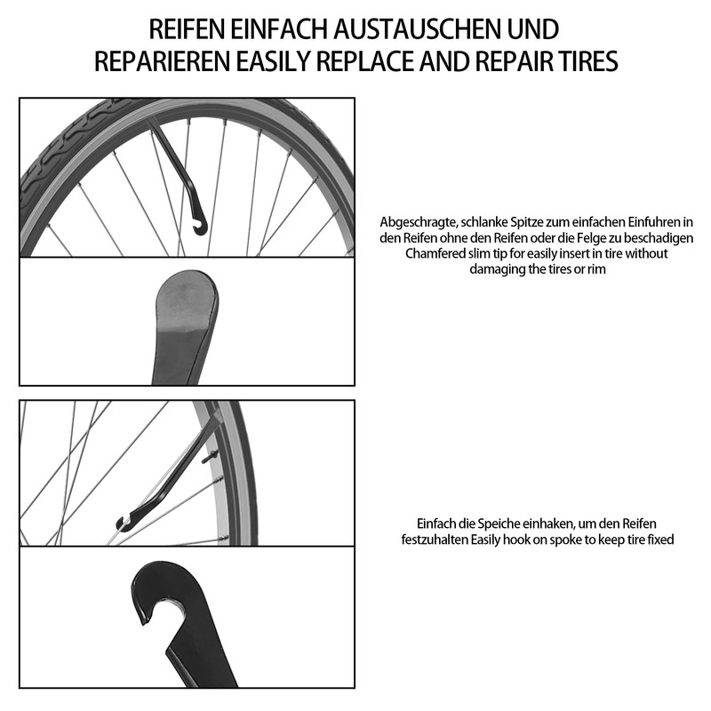 - Versatility] - These tyre levers for bicycle tools are suitable for loosening stuck tyres and are suitable for all types of bicycles, whether city bikes, road bikes, mountain bikes, e-bikes or children's bikes.