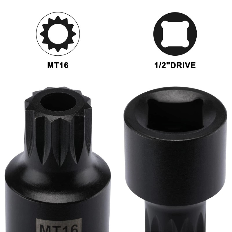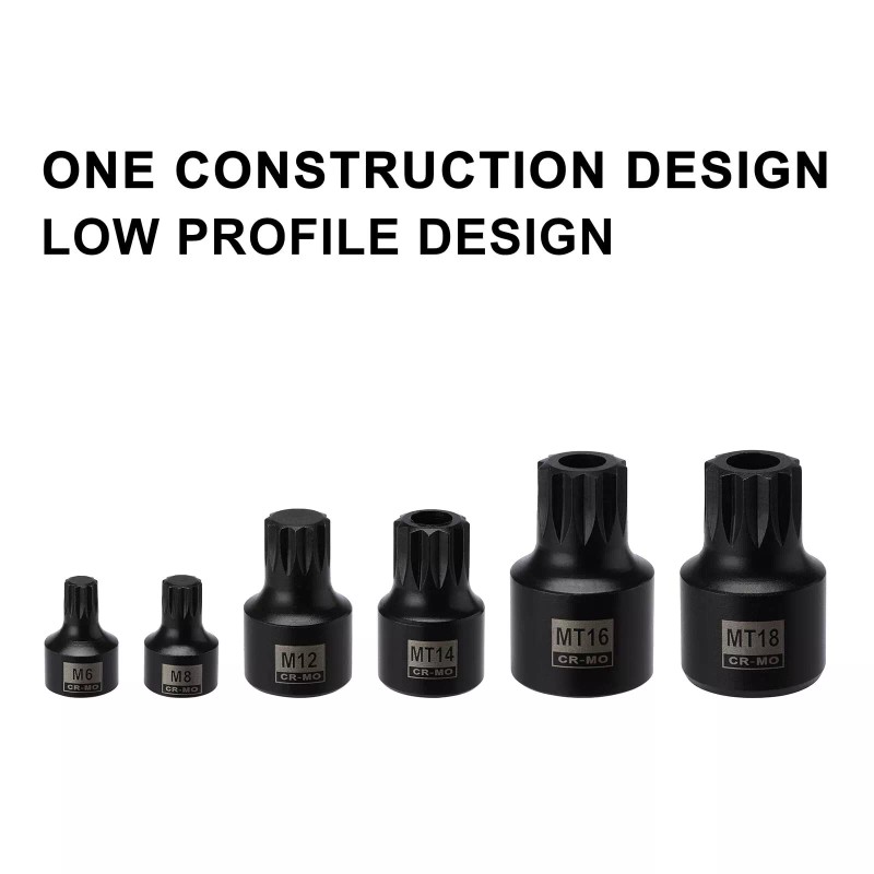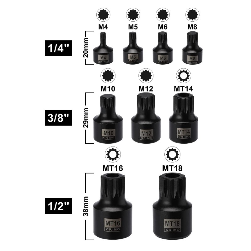 Includes: 4 pieces 1/4" Dr.bit socket: M4, M5, M6, M8; 3 pieces 3/8" Dr.bit sockets:M10, M12, MT14; 2 pieces 1/2" Dr.bit socket: MT16, MT18.