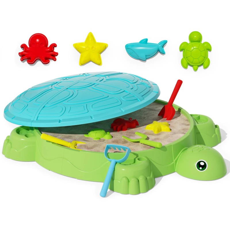 【Super Value Turtle Sandbox 】This turtle-shaped sandbox with cover (34" x 25" x 7") is designed with a friendly, smiling face, vivid eyes and a removable lid that doubles as a protective cover. Our sand box toys for kids set come with 4 sand shovels, and 4 ocean-themed molds, perfect for summer portable sand play game. Toddlers can build sandcastles, dig & create anywhere—patio, deck, or yard!