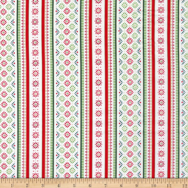 • From Maywood Studio, this printed cotton fabric is from the Joyful collection. This lightweight fabric is easy to sew, has a soft hand, and is very versatile! It is ideal for quilting, but can also be used for crafts, miscellaneous sewing projects, or home decor items like pillow covers and bed skirts. Features metallic accents. The stripe runs horizontally, selvedge to selvedge.