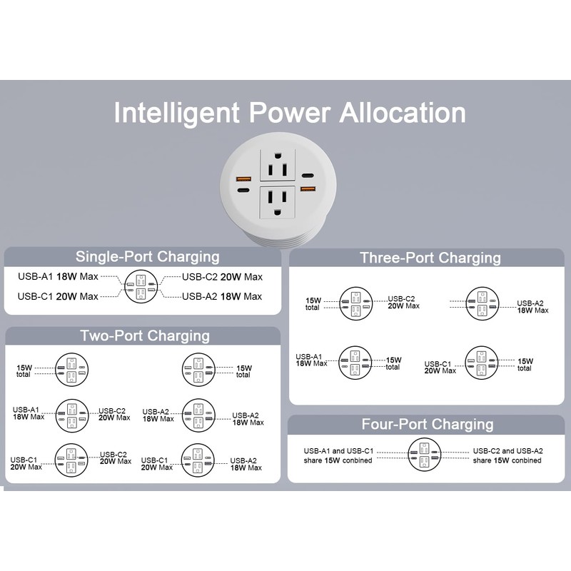 • Desktop Plug Station Rating - 110-125V,12A,1500W,60HZ,USB-A:5V/3A,9V/2A,12V/1.5A Max 18W,USB-C:5V/3A,9V/2.22A,12V/1.67A,Max 20W