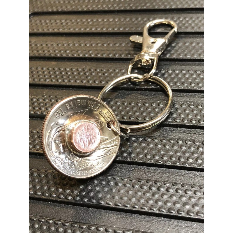 Keychain made from a real 9mm hollow point bullet and quarter. Comes with key ring and spring clasp. Make a great gift! Made in the USA.