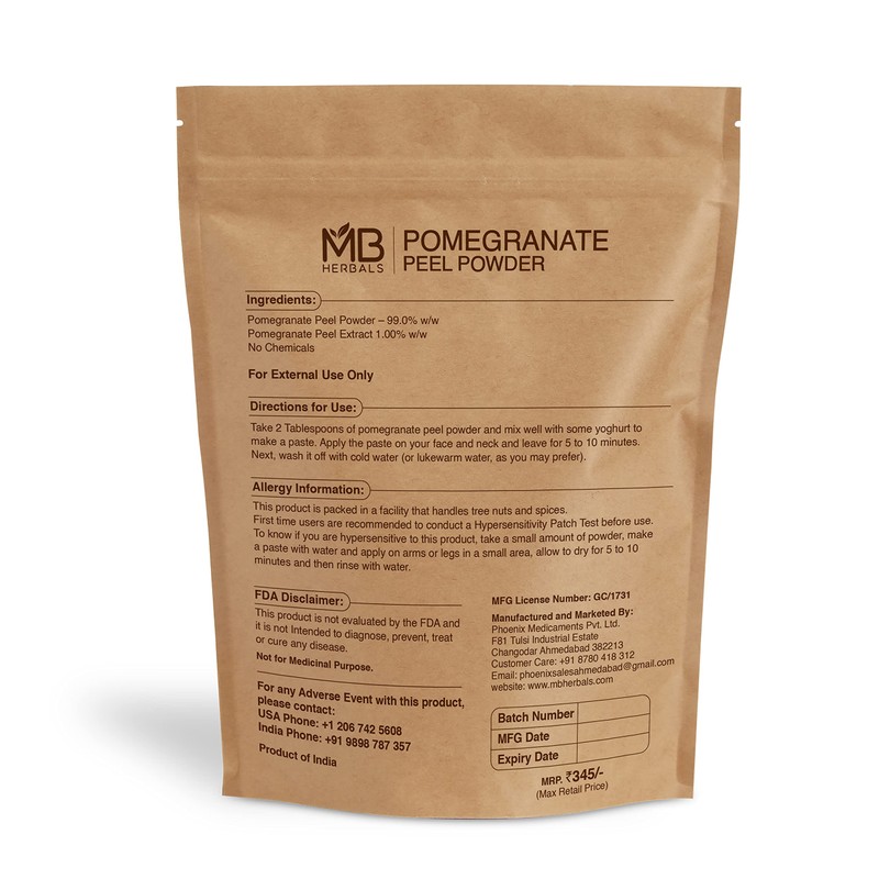- MOISTURIZING FACE PACK: Take 2 Tbsp of the Pomegranate Peel Powder and mix well with some yoghurt to make a paste out of it. Apply this paste on your face and neck and leave for 10 minutes. Next, wash it off with cold water.