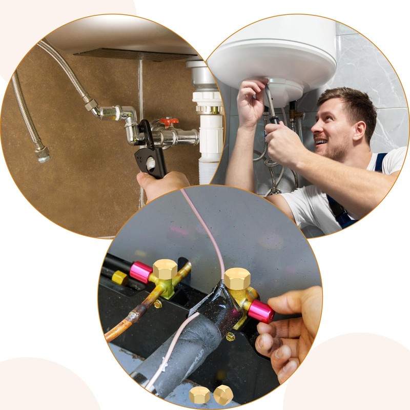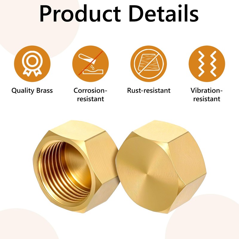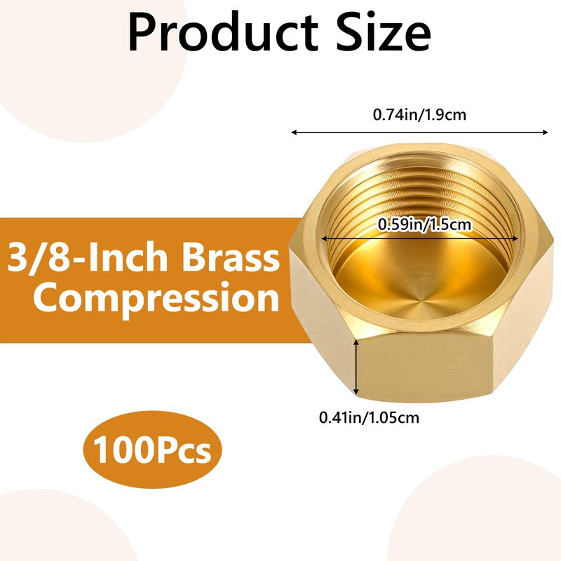 "--------------- WELCOME TO OUR SHOP ---------------" Packing List: 100pcs 3/8 Brass Compression Stop Valve Cap Single Product Size: Opposite Side: 1.9cm/0.74in Inner Diameter: 1.5cm/0.59in Material: Heavy-Duty Brass Color: Gold These 3/8 inch brass compression caps provide reliable sealing for paused or decommissioned gas, water, or fuel lines. Their precision-engineered 0.59in inner diameter creates an instant leak-proof barrier on standard 3/8" OD tubing, while the brass body withstands temperatures from -65°F to 250°F. Ideal for HVAC technicians, plumbers, and DIY enthusiasts, the caps work with washers to secure volatile fluid lines during system modifications. Use them to safely cap propane lines during appliance replacements, isolate water supply lines during valve repairs, or keep hydraulic ports cleaning. The gold-brass construction maintains integrity against UV exposure . Backed by rigorous pressure testing, these fittings meet industry standards for inert gas containment and liquid applications. Each pack includes 100 caps in protective packaging, ensuring you have sufficient inventory for fleet maintenance, construction sites, or workshop projects.