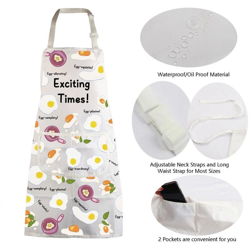 - [QUALITY MATERIAL]: Fried Egg Apron is made of 290 waterproof composite fabric, it has a unique design, with the long waist ties and an adjustable neck strap for comfortable wearing. Kitchen adjustable aprons provides superior protection from water, oil and dirty, kitchen grease, spills and food stains. Non-absorbent and washable. No harmful substances, safe for you and your family.