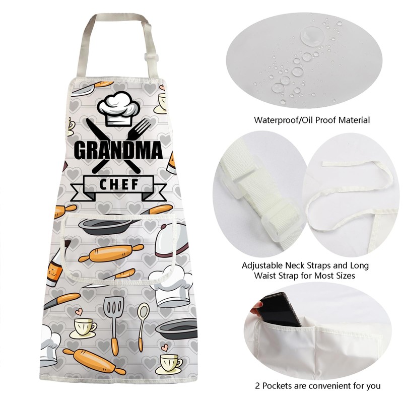 - Grandma Cooking Apron with 2 Pockets-Grandma Kitchen Apron with adjustable neck strap is designed for easy put on and take off, you can adjust the length of the string to fit you better; one size fits all. 2 pockets are designed to carry cooking tools, recipe cards, mobile phones, glasses, and more, bringing you much convenience.