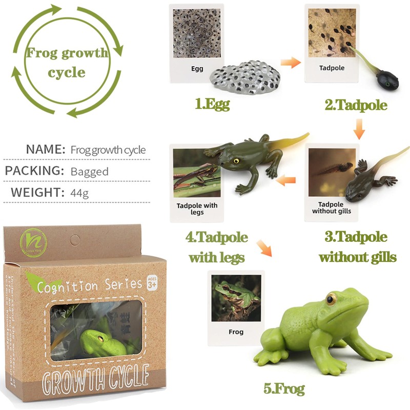 The figures of animals and card images demonstrate the life cycle of each class to help kids understand the concept of each animal's life cycle.From our tadpole to frog kit to the other plastic animal figures, your kid will surely have an enjoyable playtime!