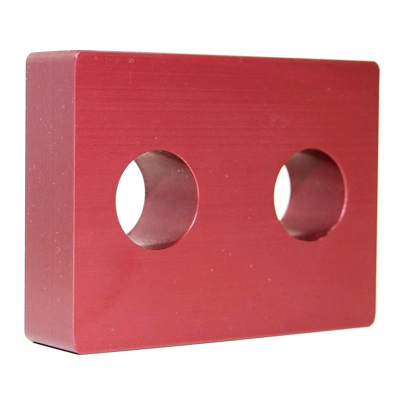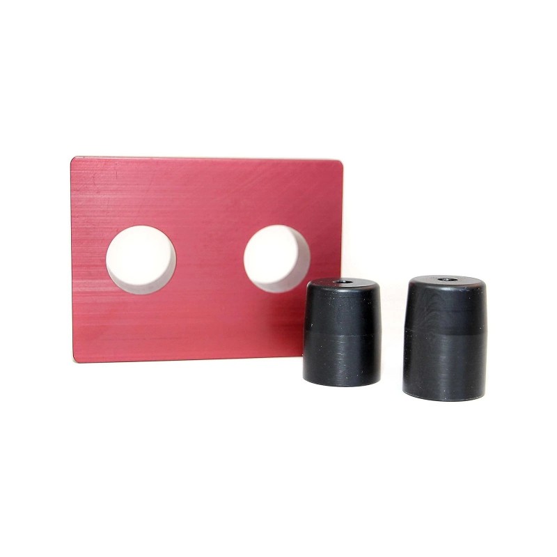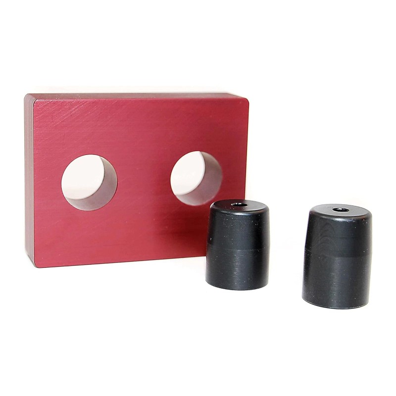 Function: the Camshaft Assembly tool will hold the camshafts and cam chain for the cam support plate to be installed onto the camshafts. We've redesigned this tool to prevent warping. Support plates made out of plastic will inevitably flex when milled, and will not be circular but oval. The support block, is made from Aluminum, which is anodized red. The inserts are black delrin.