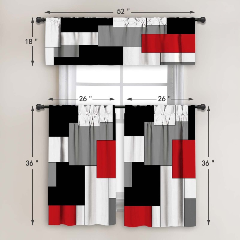 MCALK Red Kitchen Curtains Tiers and Valances Set 3 Piece for Windows Grey and Black Kitchen Window Curtains Set,White Modern Abstract Art Valances for Living Room(36" Tiers Set)