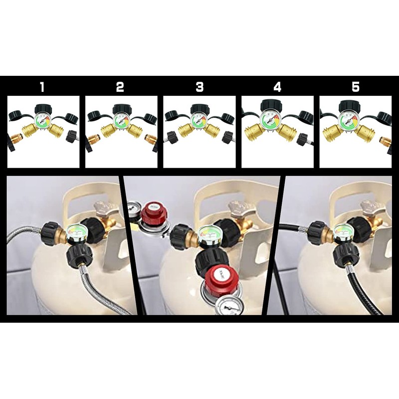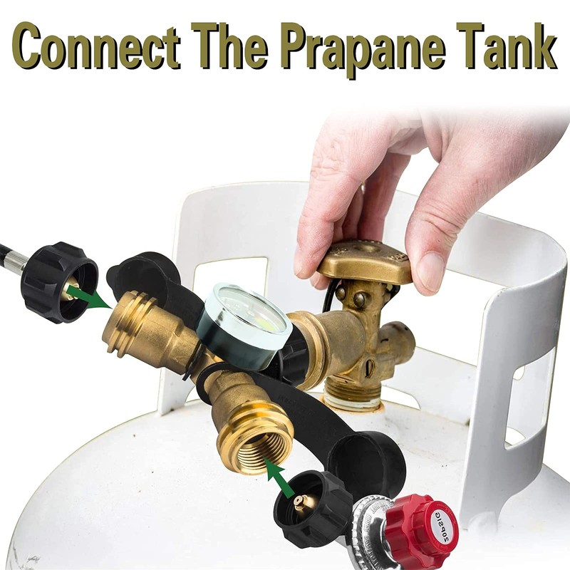 - 👉➠Y-splitter adapter with gauge level come Acme QCC1 (Type 1) connector with 2 male pipe threads, Suitable for all appliances with a Qcc1/ Type1 connection and up 5lbto 40-lb Propane tanks
