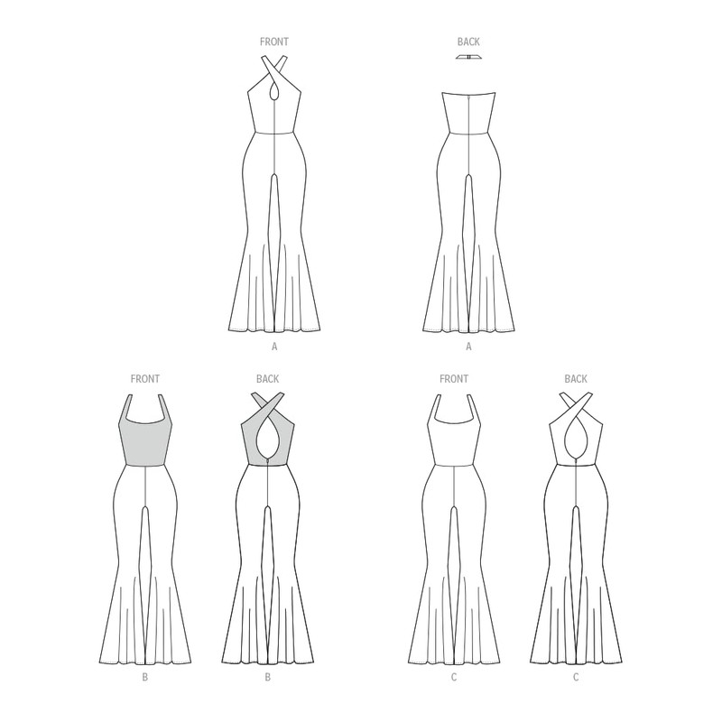 - Flare leg jumpsuits with lined bodice have crossover or scoop front halter neckline, elastic at waist, invisible zipper closure and narrow hem; view B jumpsuit has contrast bodice