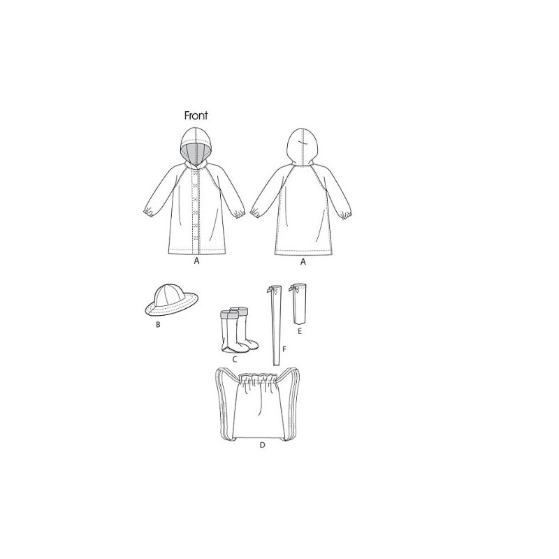 CHILDREN'S/GIRLS' RAINCOAT, HAT, BOOT LINERS, BACKPACK AND UMBRELLA CASES: A: Front closes with VELCRO ®. Instructions for working with vinyl and laminated fabrics are included. SUGGESTED FABRICS: A,B,D,E,F: Vinyl Coated Fabric. Contrast A, Lining B: Cotton/Cotton Blends. C, Interfacing B: Fleece. NOTIONS: A: 1/4 yd. of 3/4" VELCRO ®, 3/8 yd. of 3/4" Elastic. D: 23/8 yds of 5/8" Ribbon. E,F: 3/4 yd. of 5/8" Ribbon. * With Nap **Without Nap ***With or Without Nap Combinations: Kids [(3-4), (5-6), (7-8)] Hat fits head sizes: [XS(20"), S(203/4"), M(211/2"), L(22")] Foot sizes: [S(61/4"), M(71/4"), L(8"), XL(81/2")]