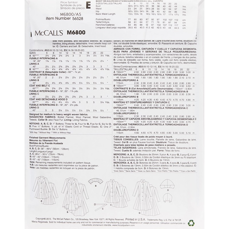 McCall's Patterns M6800 A5 6 - 8 - 10 - 12 - 14 Misses' - Miss Petite Lined Coats, Belt and Detachable Collar and Hood, Pack of 1, White