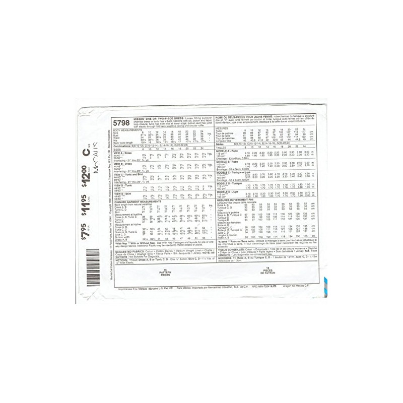 McCall's Patterns MCC 2026 Costumes McCalls 5798 One or Two-Piece Dress Size ...