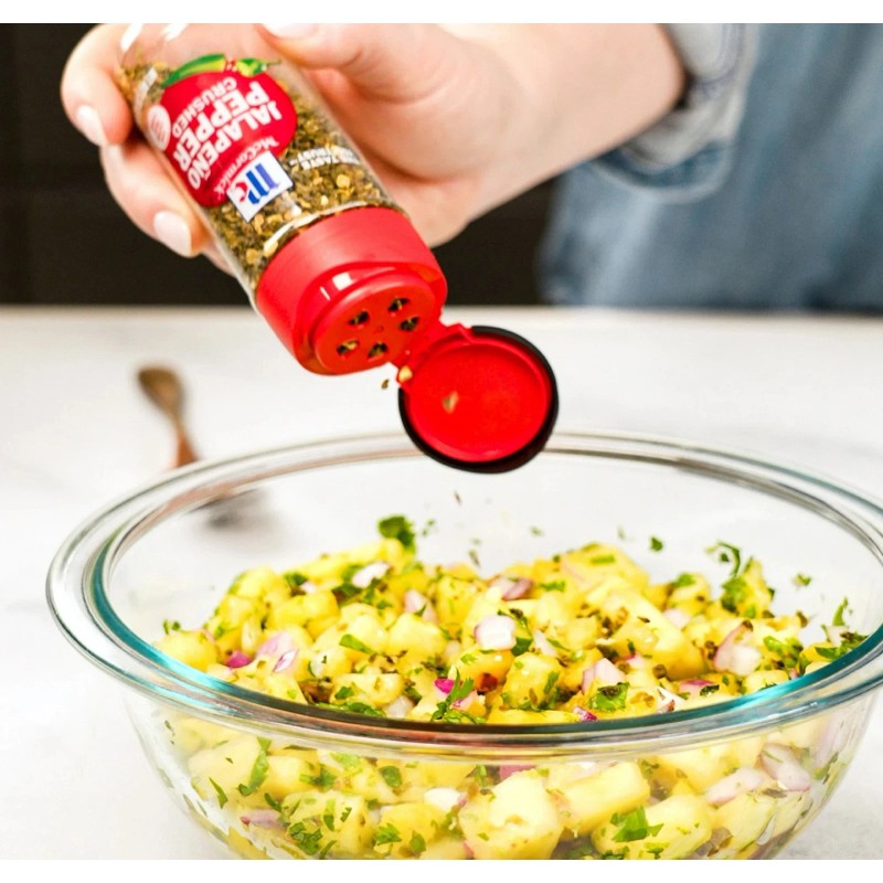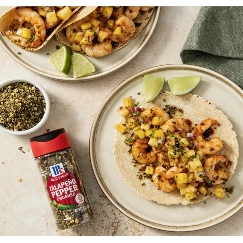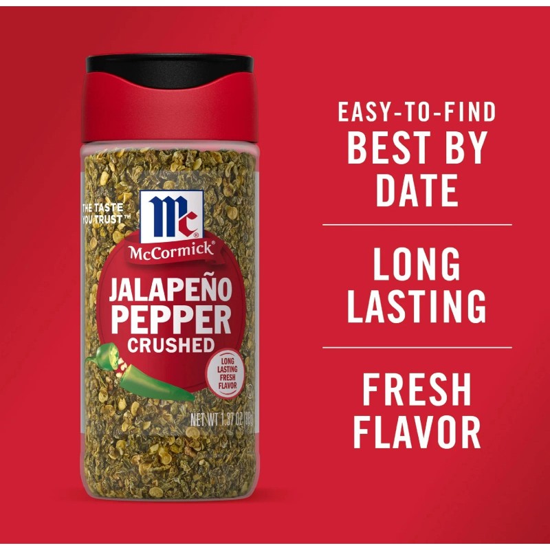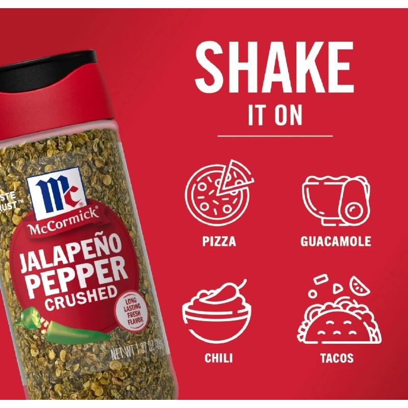 McCormick Crushed Jalapeno Pepper, 1.37 oz Bottle. With McCormick Crushed Jalapeño Pepper on your spice rack, you will always have jalapeños on hand. Add its bold, distinctive flavor and moderate heat to dishes from chili, tacos and nachos to guacamole and pizza. No prep needed with our Crushed Jalapeño Pepper. We’ve cored, diced and dried fresh jalapeños so they’re ready to use. Add them wherever you want a kick of medium heat. Great in salsa, enchilada sauce, stews, soups and marinades. Versatile Crushed Jalapeño Pepper is also a lively spice for dips, cream cheese, scrambled eggs and cornbread. Make your cookout into fiesta with Crushed Jalapeño Pepper in spicy margaritas, jalapeno burgers, ceviche, the marinated seafood salad, and elotes, the grilled corn-on-the-cob.  Source Euromonitor International Limited, Cooking Ingredients and Meals 2023ed, McCormick (McCormick & Co Inc), Herbs and Spices retail value sales, World, 2022 data. This McCormick Crushed Jalapeno Pepper is in a Plastic bottle that is 1.37 ounces. Store this shelf-stable item at an ambient temperature.