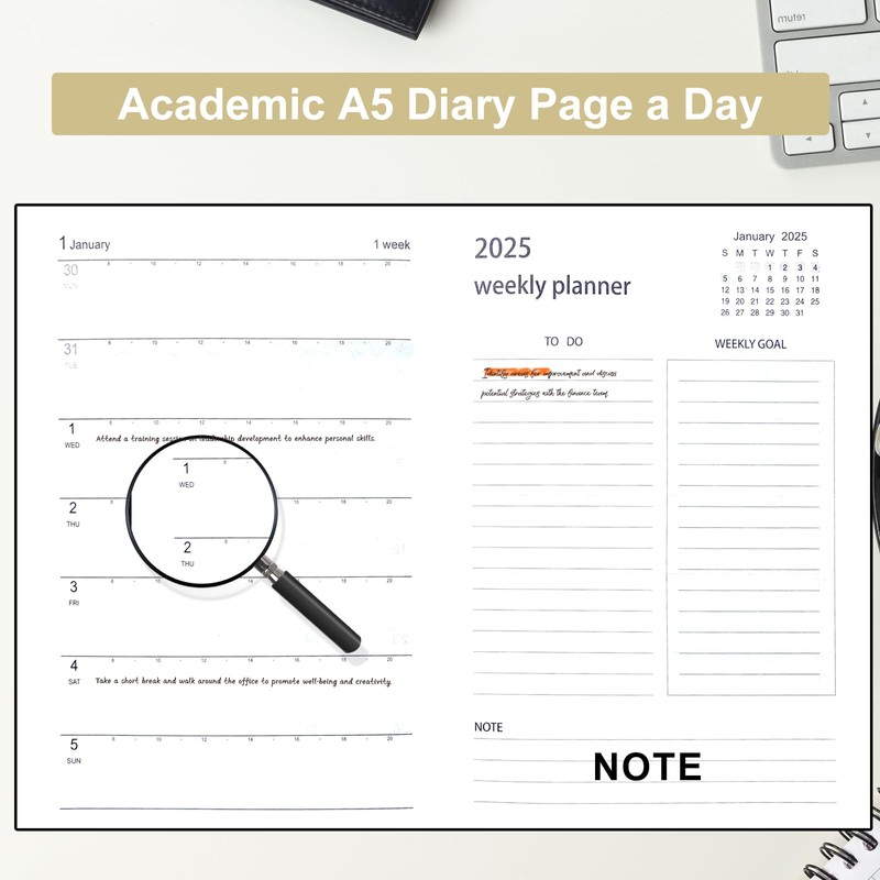 - 2025 A5 Week to View Diary-The planner plenty of space to jot down your daily to-do list and weekly plans. The layout is clean and simple, with sections for everything you need to stay organized, including goals, tasks, and notes.to help with your planning and to help keep to routines, and focus on tasks ect.