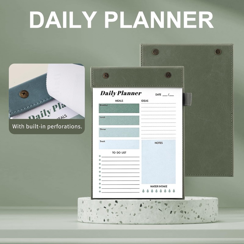 Mcdsuc Daily Planner Notepad,Meal Planning and To-Do List, Removable Inner Core,Tear and Write,Pen Holder,Green Leather Cover,21.2 x 14.5 cm,for Your Daily Life Plan (Green, Daily Planner)