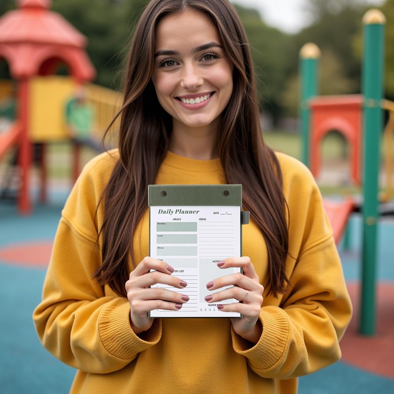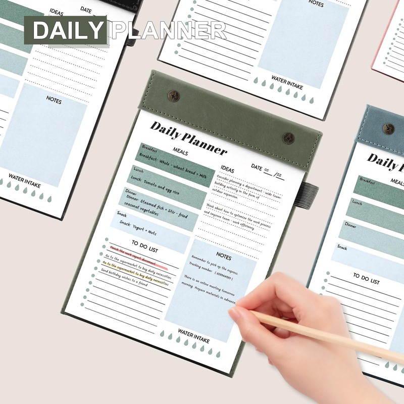 Stay organised and on track with this elegant daily planner notepad featuring a sophisticated green leather cover. Measuring 21.2 x 14.5 cm, this comprehensive planner helps you structure your day efficiently with dedicated sections for meal planning, including breakfast, lunch, dinner, and snacks. The thoughtfully designed layout includes a detailed to-do list section, an ideas space for creative thoughts, and a convenient notes area. Track your daily water intake with the charming water drop indicators. The planner comes with a practical pen holder, ensuring your writing tool is always at hand. The thick paper quality prevents ink bleed-through, while the sturdy backing board provides excellent writing support. Each page is easily detachable, making it simple to remove completed pages or share notes. The premium construction and functional design make this planner perfect for both professional and personal use.