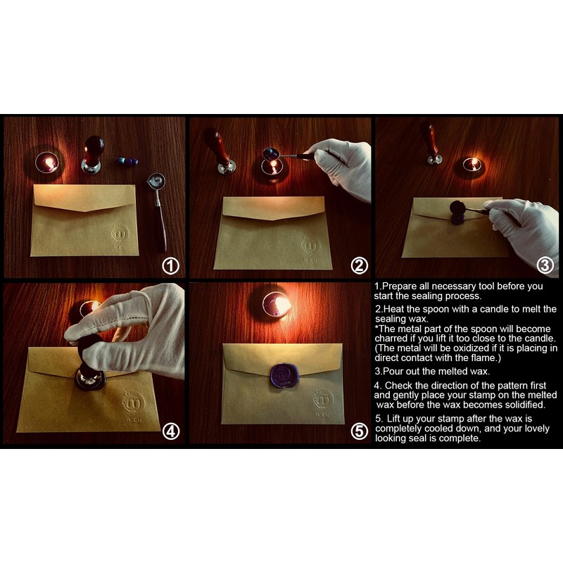 3)Moisten your seal with a little oil to prevent the melted wax stick on the stamp before use and prepare a wet towel to cool down the seal especially for the case you are making much seal at once.
