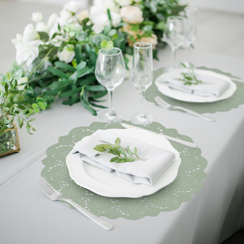 MCEAST 100 Pack Round Sage Green Paper Doilies 13.5 Inches Lace Paper Place Mats Rustic Scallop Doily Disposable Table Pads for Food Cakes Crafts Party Weddings Tableware Decor