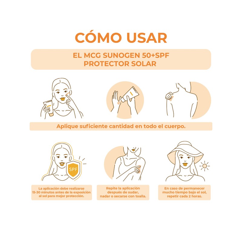 McG SUNOGEN Sunscreen Sun Cream SPF 50 Face Moisturiser is applied sufficiently to the skin before exposing it to the sun. Repeat the application process after sweating, swimming, and toweling yourself. The application should be performed 15-30 minutes earlier before exposing to the sun the penetration of the products into the skin. In the case of staying under the sun for a long time, the product should be renewed every 2 hours.
