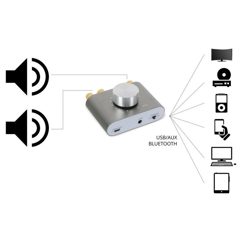 - USB input – The micro USB port allows the use of the MAMP-250BT as an external sound card, which also allows passive speakers to be used at the desk.
