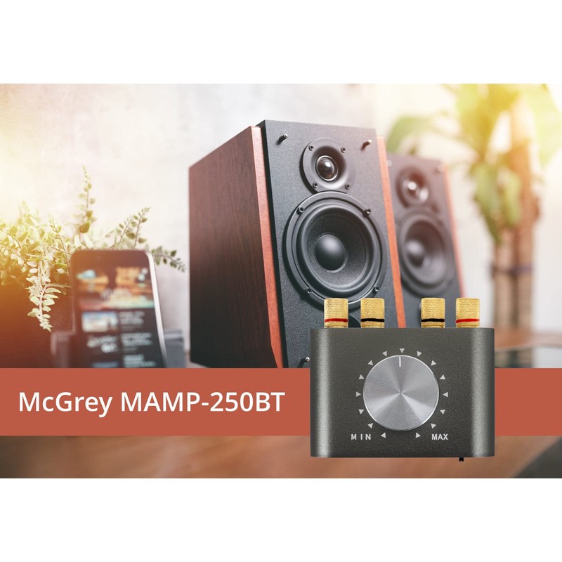McGrey MAMP-250BT Mini HiFi Amplifier 100 Watt Ultra Compact Stereo Amplifier 2 x 50 Watt Bluetooth 5.0, Jack and USB Input Clamp Connections for 2 Speakers Grey Metallic