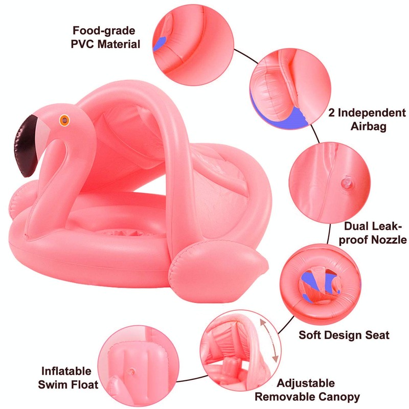 - 🏊♂Dimension and Suitable Age:Flamingo Inflatable Size:17inch(H) x 35inch(L) x 25inch(W);Seat Size:Inner Diameter:7.9inch,Outer Diameter:24.8inch;Canopy Height:21.7inch.This pink flamingo baby float is suitable for the age 6months-4 years old babies (suitable for baby weight max up to 66lbs).If baby exceeding the weight, please take special care.Please Note:The baby swim ring is not life-saving supplies, babies is required accompanied by a guardian!