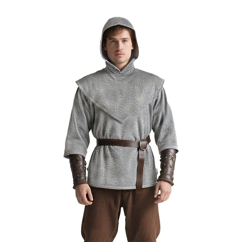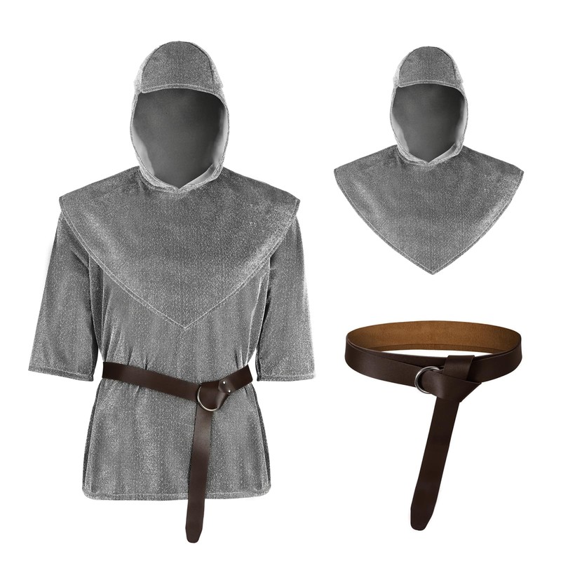 MCJC Medieval Knight Imitative Chain Mail Costume, Renaissance Armor Shirt with Hood and Belt, Gray