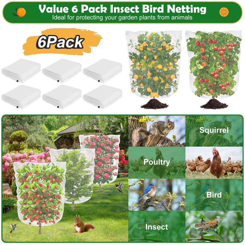 • 【6 Pack Plant Netting】You will receive 6 packs of 3.2 x 5.2Ft white plant netting with adjustable drawstrings, suitable for all sizes of plant saplings, effectively protecting your plants, fruits, flowers, trees, and vegetables from birds, squirrels, chickens and other animals.
