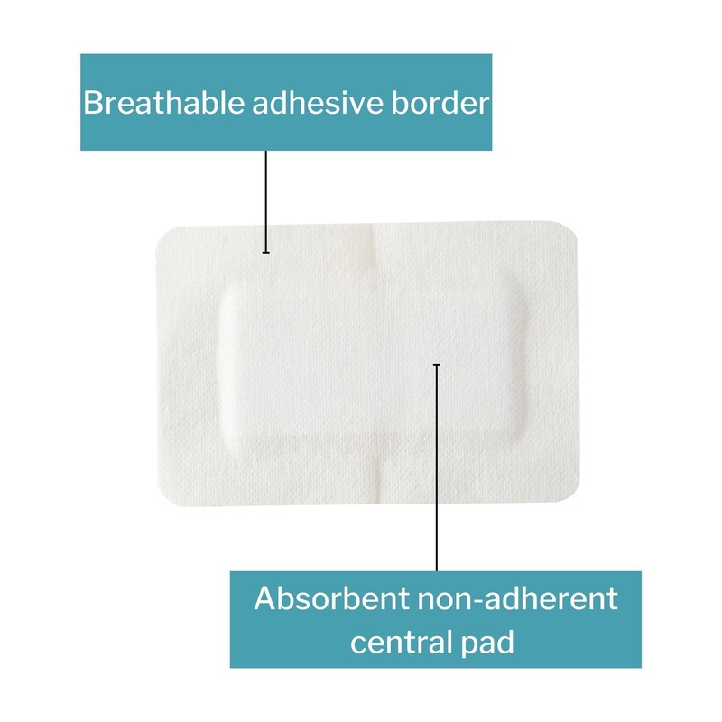 - Dressing measures 4 inches x 6 inches, with an island pad size of 2 inches x 4 inches