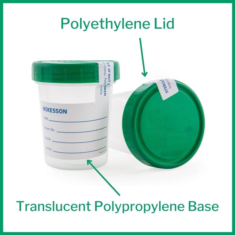 Collect specimens safely with a McKesson polypropylene specimen container. Every plastic container is sterile. The medical specimen container has a leak-resistant screw-on lid which makes transporting the specimen easy and minimizes the risk of spilling what is being tested. McKesson specimen collection containers are single-use items, and disposing of them after each use will maintain a hygienic environment. Since the container is latex-free, it can safely come in contact with the skin during sample collections. The sterile specimen container has a capacity of 120 milliliters or 4 ounces and has a white label in the front to specify patient details. The 120 milliliter specimen container has a polypropylene base with an transparent body that's graduated with markings, allowing the caregiver to see the type and amount of specimen collected inside.