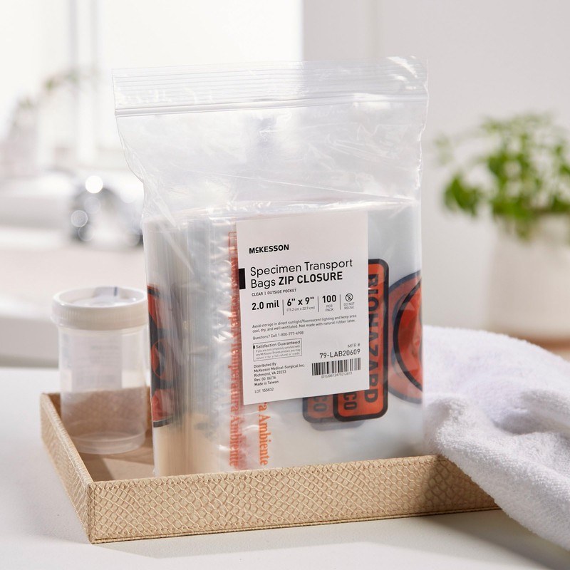 McKesson Specimen Transport Bag, Biohazard, Zip Closure, 2 mil Thickness, 6 in x 9 in, 100 Count