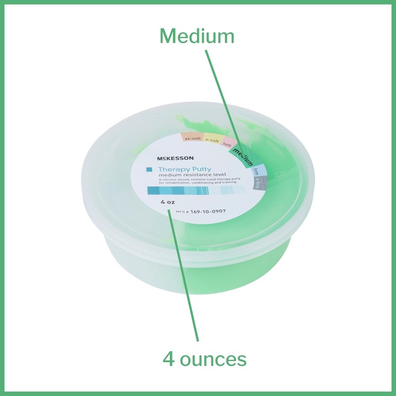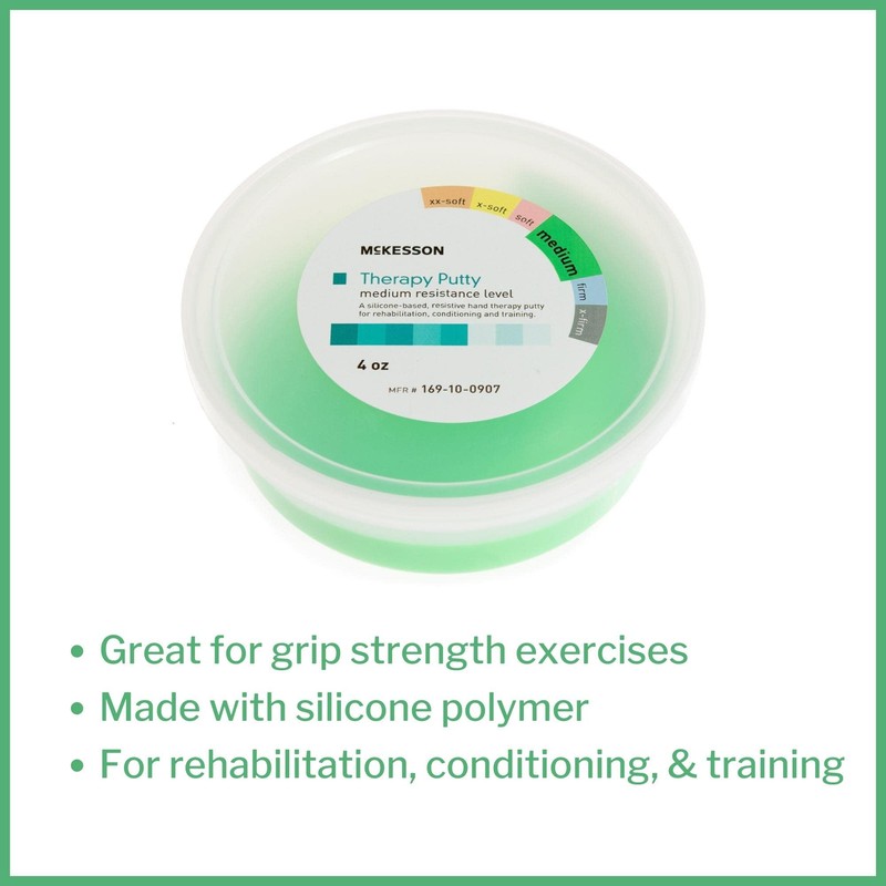 McKesson therapy putty is designed to increase flexibility, improve strength, combat stiffness, decrease stress and relieve joint pain in your fingers, hands, wrists, and forearms. Stretch, squeeze, twist, or pinch McKesson therapy putty using a variety of different hand, finger, and wrist exercises. McKesson therapy putty is available in convenient, easy-to-open plastic containers to use at home. Green therapy putty signifies medium resistance. Rehabilitation putty is made of a non-toxic, non-scented silicone polymer.