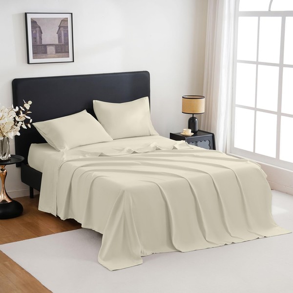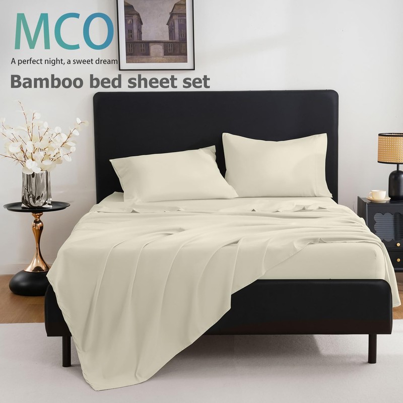 MCO Breathable Bed Sheets Set - Rayon Derived from Bamboo Sheets - Cool Bedding Set with 16" Deep Pocket (4 Pcs, Queen, Off White)