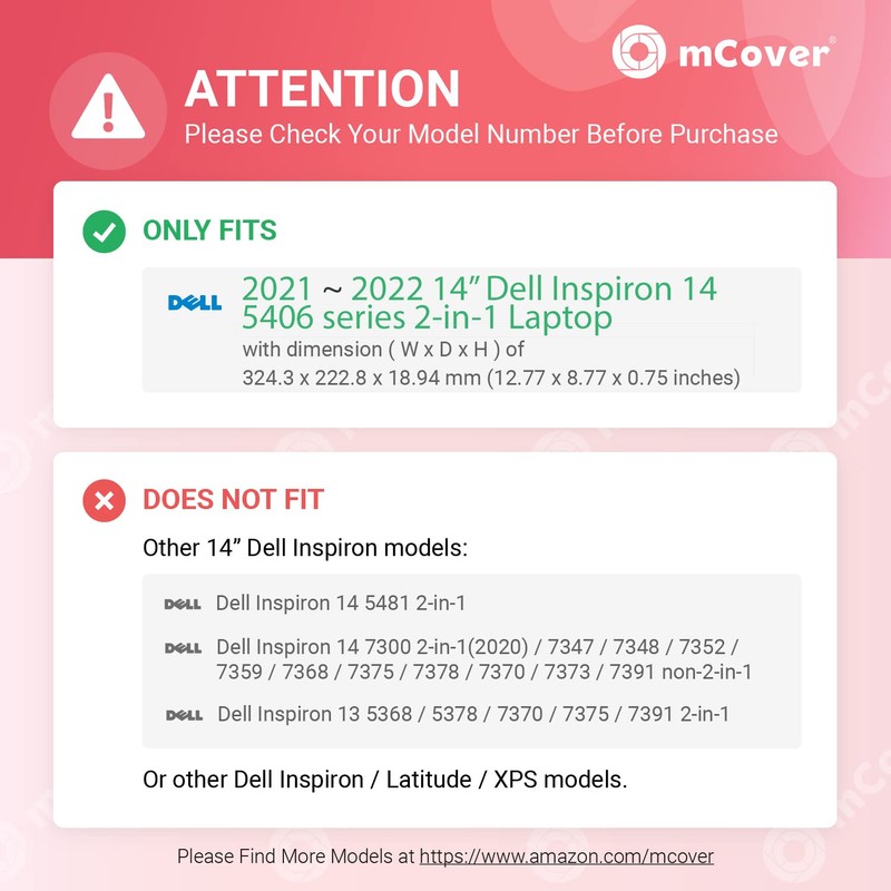 - Designed to perfectly fit the 2021-2022 14" Dell Inspiron 14 5406 series 2-in-1 convertible Laptop Computer with dimension of 12.77 x 8.77 x 0.75 inch ( 324.3 x 222.8 x 18.94 mm )