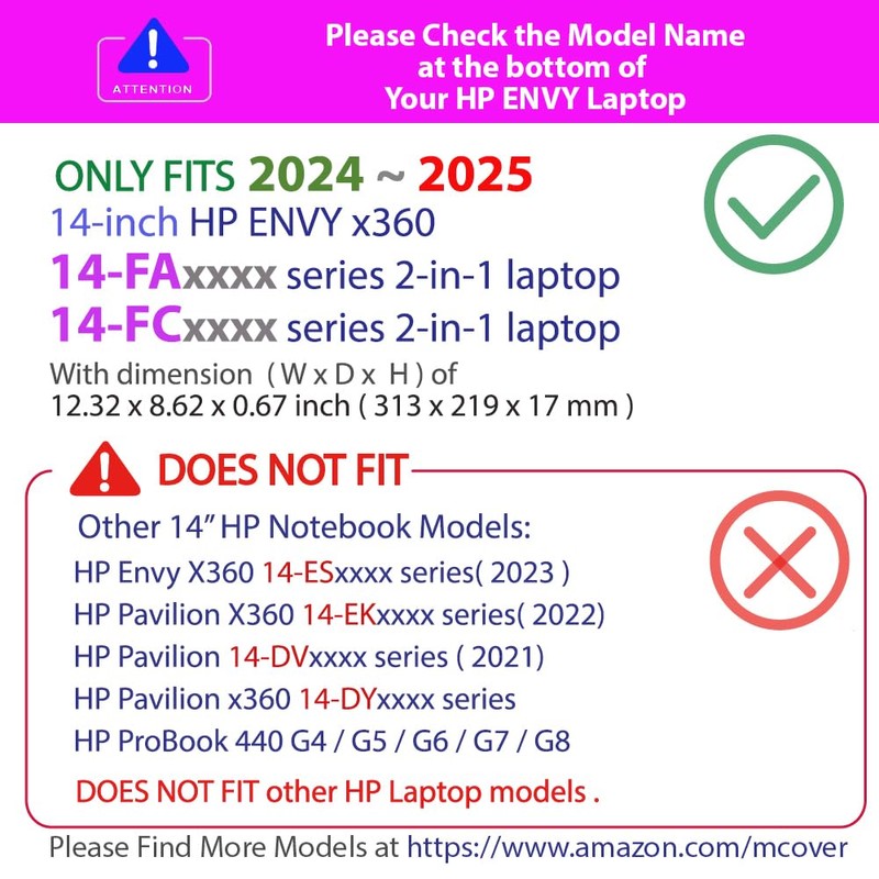 - Designed to perfectly fit the 2024 or newer 14" HP ENVY x360 14-FAxxxx / 14-FCxxxx series Laptop with dimension of 12.32 x 8.62 x 0.67 inch ( 313 x 219 x 17 mm )