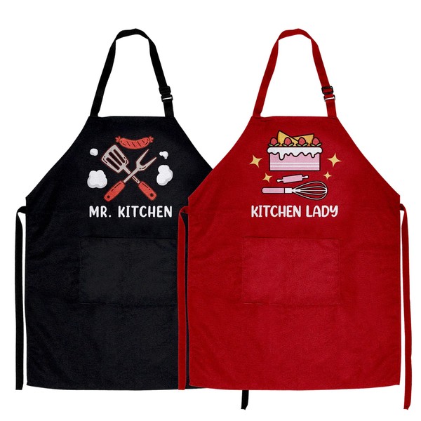 - Couple design: This cute apron shows interesting designs like cooking tools, sausages and cakes, supplemented by "MR. KITCHEN" "KITCHEN LADY" copywriting to show the beautiful love title of the matching couple and couple costumes for adults funny