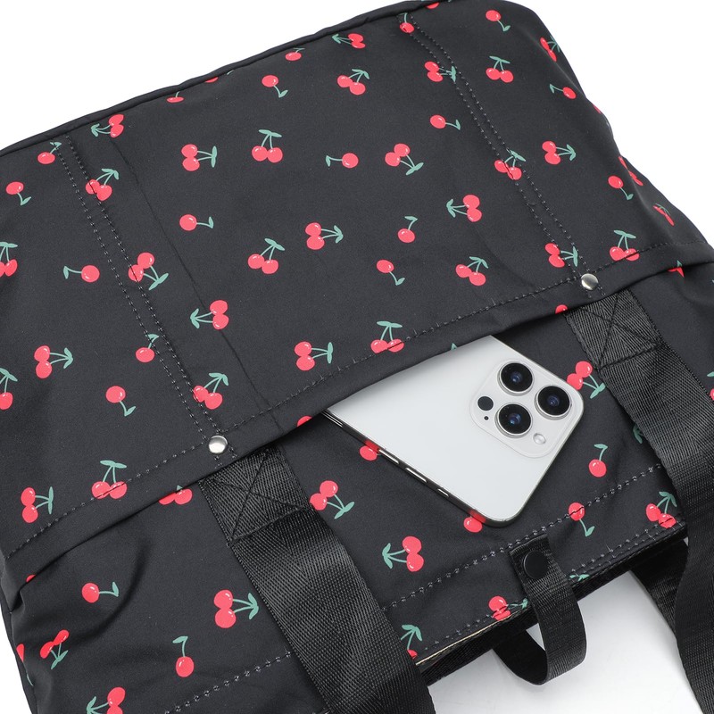 mcuvaec Foldable Floral Tote Bag for Women Nylon Travel Handbag with Zipper Cherry Print Purse Daily Commuter Bag for Work (cherry black)
