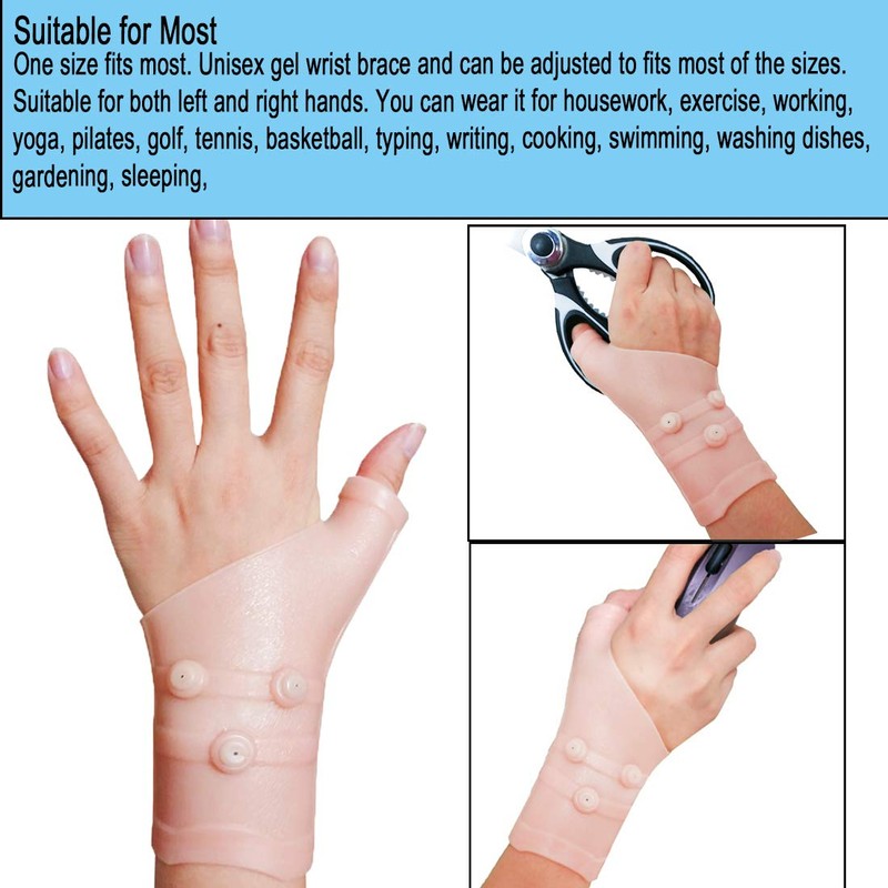 - ARE YOU LOOKING THIS? - One size fits most. Unisex gel wrist brace and can be adjusted to fits most of the sizes. Suitable for both left and right hands. You can wear it for housework, exercise, working, yoga, pilates, golf, tennis, basketball, typing, writing, cooking, swimming, washing dishes, gardening, sleeping, etc.
