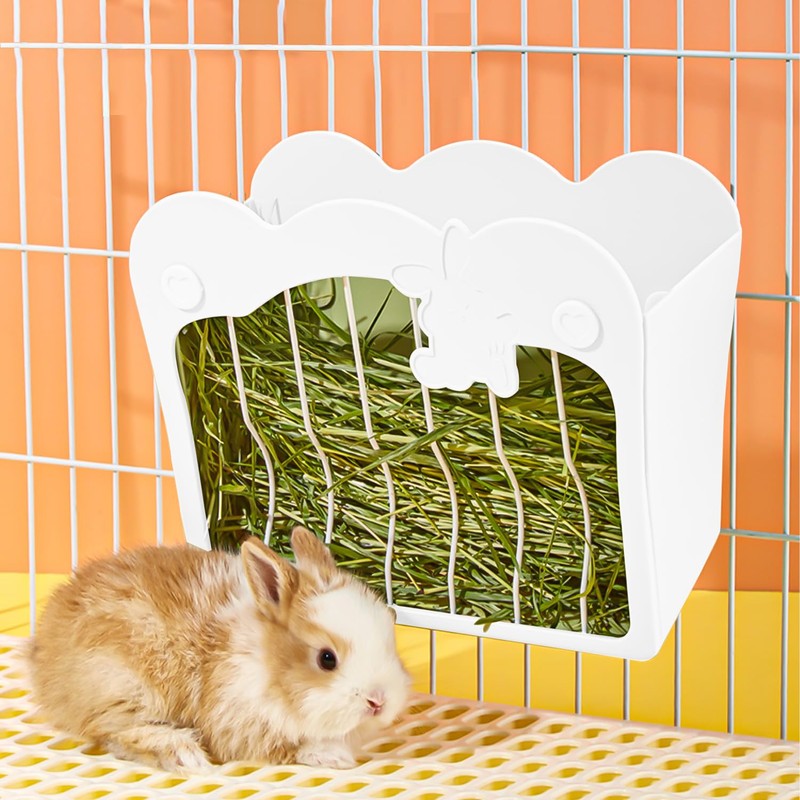 MdakeGo Rabbit Hay Feeder, Hanging Rabbit Hay Feeder Rack for Internal and External Cage, Reduce Mess, Cage Hanging Hay Holder for Rabbits Chinchilla Bunny Guinea Pig (White)