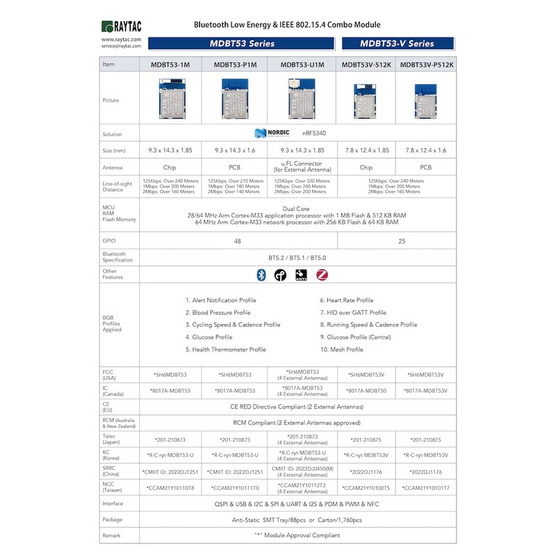 - BT5.2, FCC, IC, CE, Telec (MIC), KC, SRRC, NCC, RCM, WPC Pre-Certified