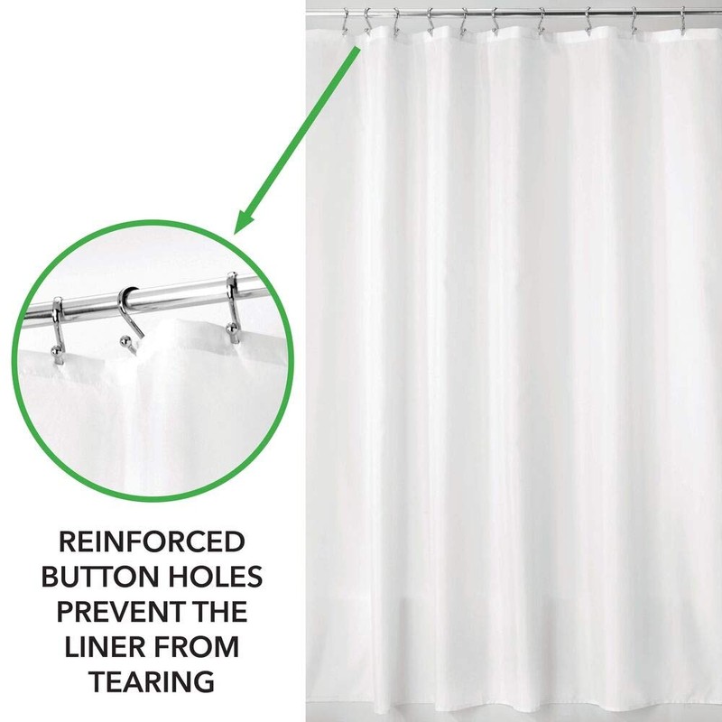 - REINFORCED BUTTON HOLES: Reinforced button holes work with most types of shower hooks and rings for quick and simple installation (not included) ; Top hem is reinforced to hold up to long term use and will help this curtain keep its shape; This shower curtain will complement any bathroom, use at home, apartment, condo, hotel, camper, RV, dorm, school shower, athletic club, gym and everywhere else you need a reliable shower curtain or liner