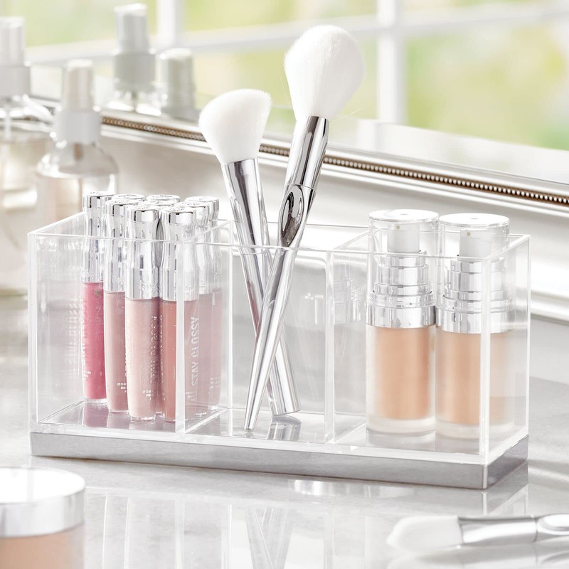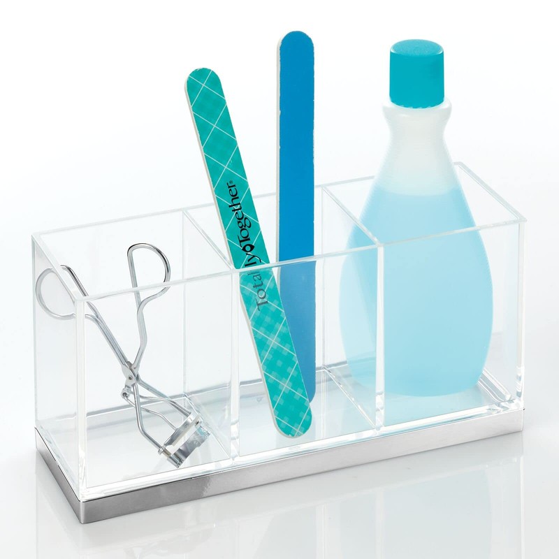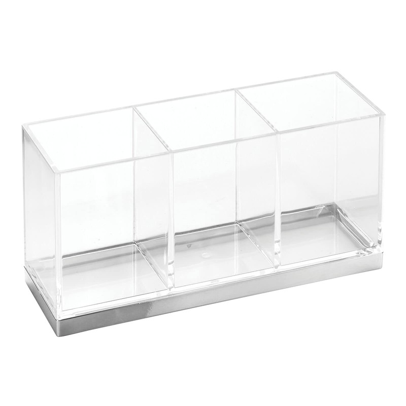Keep cosmetics organised and within easy reach - with the modern make-up holder from mDesign! The practical cosmetic organiser from mDesign keeps all make-up and care products clean and tidy, while it looks good. Thanks to its modern design, this attractive make-up container is a versatile eye-catcher. Made of durable plastic, the organiser can easily withstand all requirements. The box is not dishwasher safe, but can be easily wiped clean with a little water and a mild soap. The product features in detail: cosmetic storage box with 3 compartments, ideal for powder brush, eye shadow, toothpaste, eyeliner, etc., not dishwasher safe, material: plastic, colour: clear and silver, dimensions: 7.6 cm x 22.9 cm x 10.8 cm, model number: 15999MDCEU