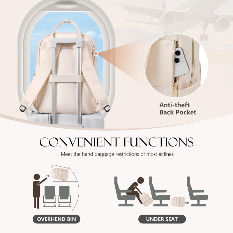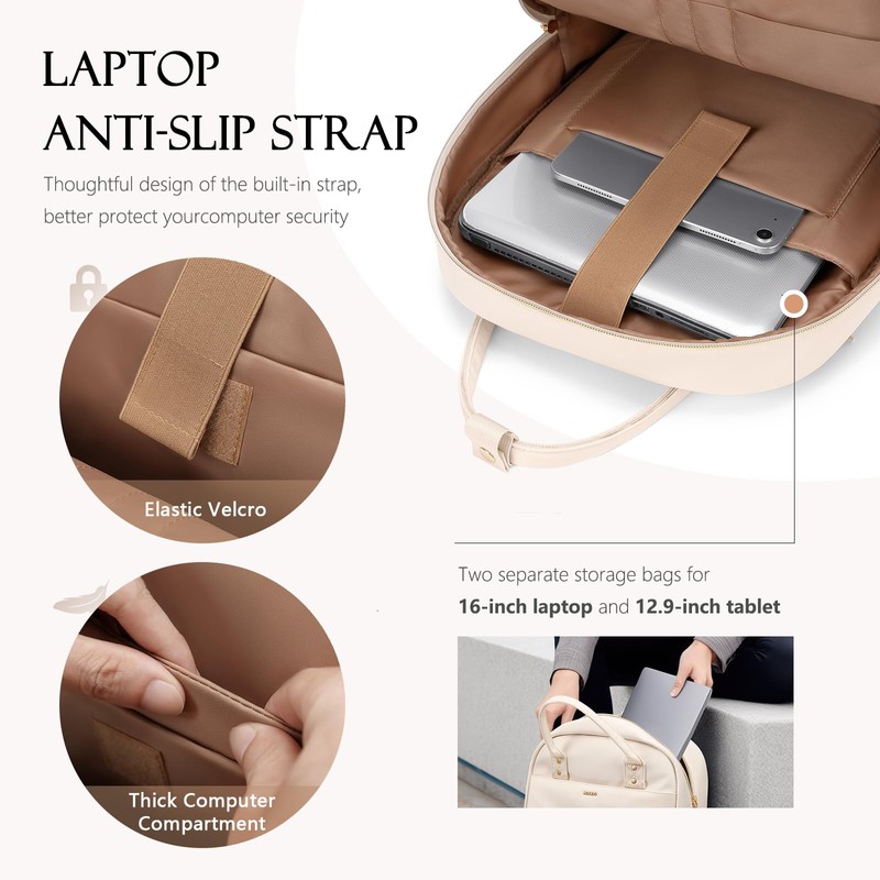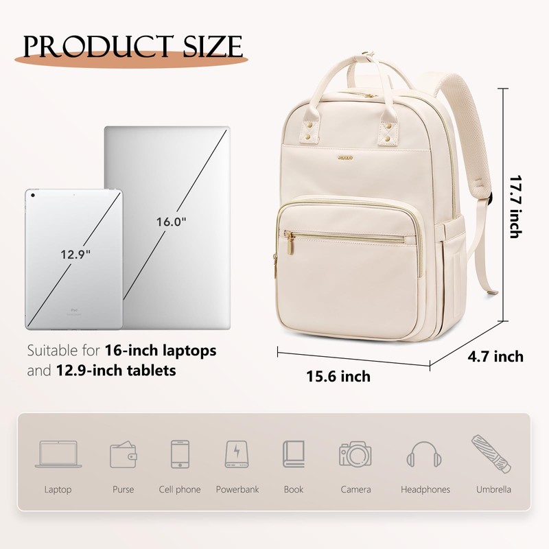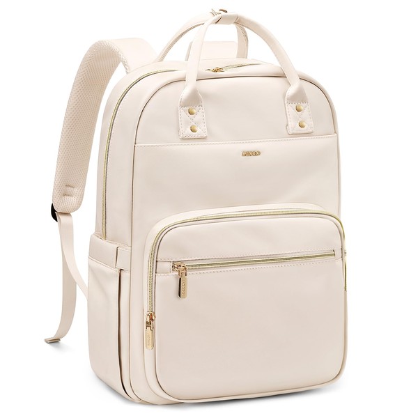 MDODO - Mochila para portátil para mujer, 15.6 pulgadas, mochila para portátil con compartimento para portátil, impermeable, mochila, Beige, 40.64 cm, Mochilas de viaje